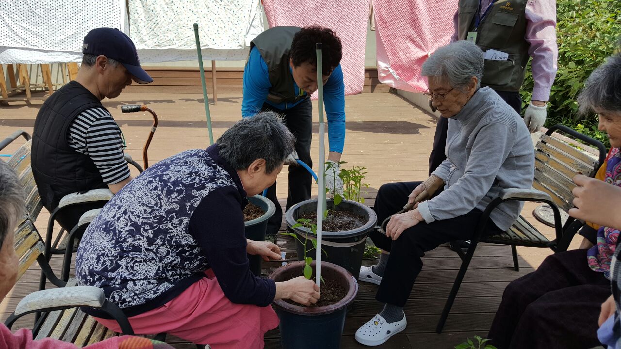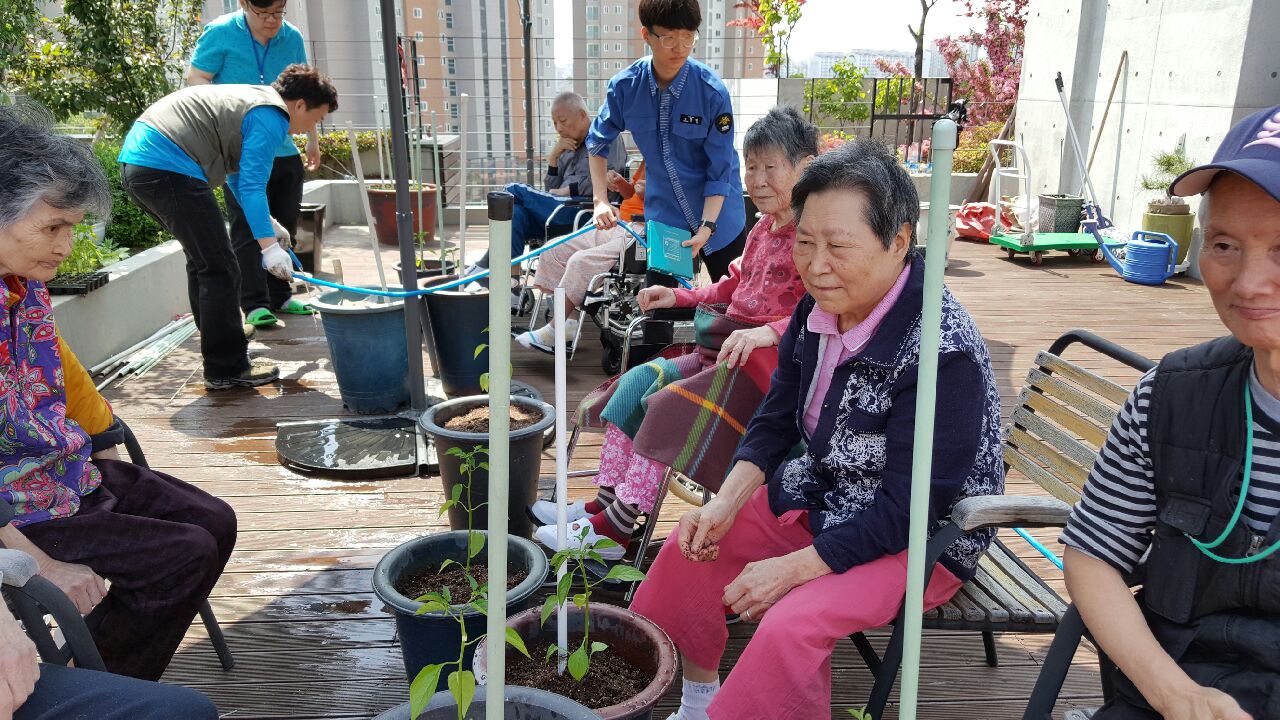 어르신들과 함께 고추와 상추 모종을 심었습니다. 함께 물도주며 담소도 나누었답니다.