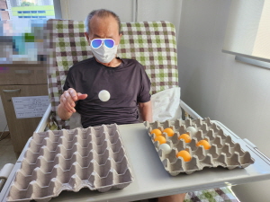 탁구공을 튕기거나 던져서 계란판에 넣는 신체활동 수업을 했어요.