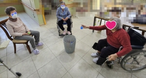 바구니를 어르신 가까이 놓아드려 공을 던져 넣는 ‘공 던지기 ’수업을 했어요.