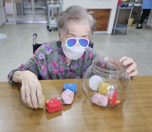 어르신들과 오재미(편백나무)향을 맡아보면서 소근육과 후각을 자극하는 시간을 갖는 수업을 했어요.