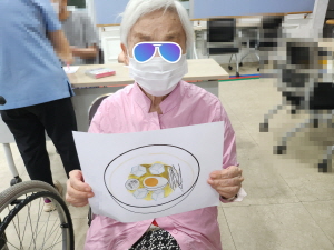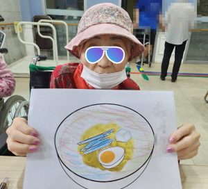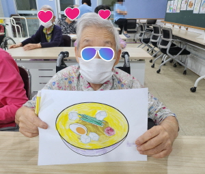콩국수 그림 도안을 색연필로 색칠한 후 오이, 방울토마토, 계란 등의 고명을 색칠해서 콩국수 도안 위에 풀로 붙이는 미술활동을 했어요.