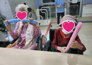 A그룹은 스티로폼 막대를 손에 쥐고 음악에 맞춰 머리 위로 들어 올리거나 좌우로 움직이는 동작을 반복하면서 근육을 풀어주는 신체활동 수업을 했어요.